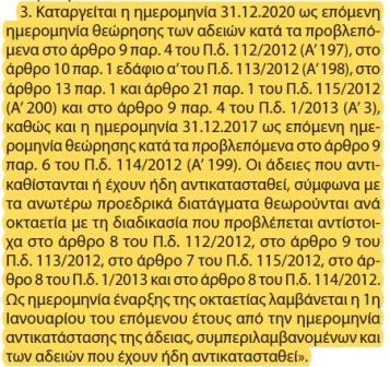 Ως εκ τούτου, σύμφωνα με το άρθρο 16 παράγραφος 3 του νόμου 4403, οι Οι άδειες που αντικαθίστανται ή έχουν ήδη αντικατασταθεί, σύμφωνα με τα ανωτέρω προεδρικά διατάγματα θεωρούνται ανά οκταετία με τη διαδικασία που προβλέπεται αντίστοιχα στο άρθρο 9 του ΠΔ 113/2012, και αναφέρει ως ημερομηνία έναρξης της οκταετίας λαμβάνεται η 1η Ιανουαρίου του επόμενου έτους από την ημερομηνία αντικατάστασης της άδειας, συμπεριλαμβανομένων και των αδειών που έχουν ήδη αντικατασταθεί.