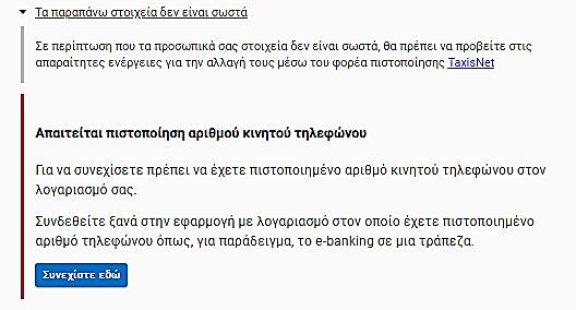 Εφόσον επιλέξετε να εισέλθετε με τους κωδικούς του TAXIS θα πρέπει να έχετε πιστοποιημένο κάπου το κινητό σας τηλέφωνο, και η εφαρμογή σας οδηγεί να επιλέξετε την πιστοποίηση μέσω των κωδικών web banking.