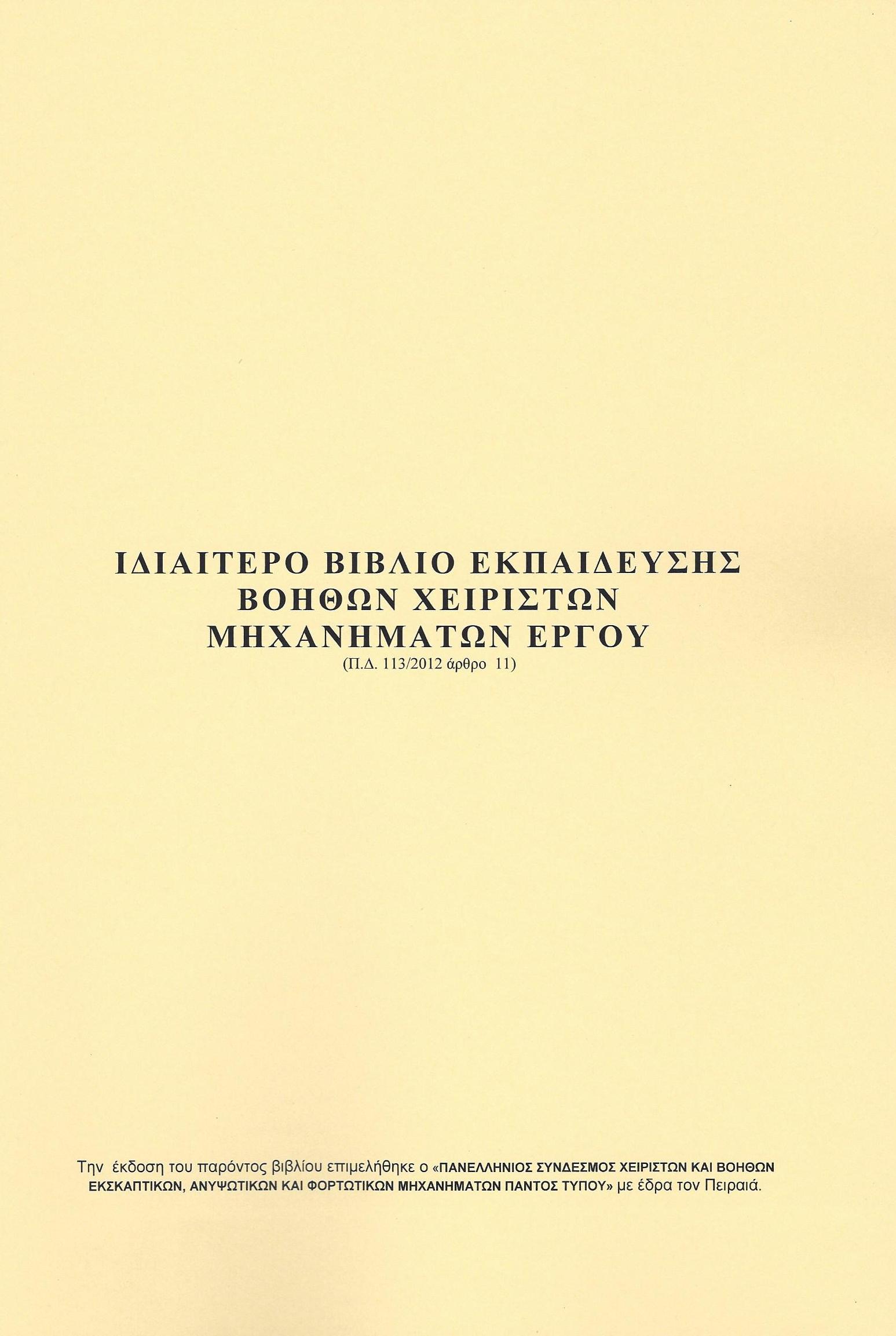 Σύμφωνα με το άρθρο 11 του ΠΔ 113/2012 (ΦΕΚ 198/Α/2012) η κάθε επιχείρηση που έχει μηχανήματα έργου πρέπει να παρέχει στους βοηθούς αντίγραφο μερίδας που τον αφορά από το ιδιαίτερο βιβλίο εκπαίδευσης, που να συνυπογράφετε με τα πλήρη στοιχεία της επιχείρησης καθώς και τα στοιχεία του μηχανήματος από την εργοδότρια εταιρία, τα πλήρη στοιχεία του εκπαιδευτή χειριστή, και τα πλήρη στοιχεία του εκπαιδευόμενου βοηθού ή χειριστή.